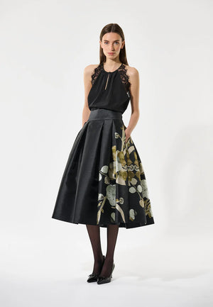 Deep box pleats gather into a wide waistband before flaring out in this full skirt that falls to mid calf. Crafted from black taffeta printed with oversized lotus blooms, it is perfect for evening paired with a simple shirt or fine knit.