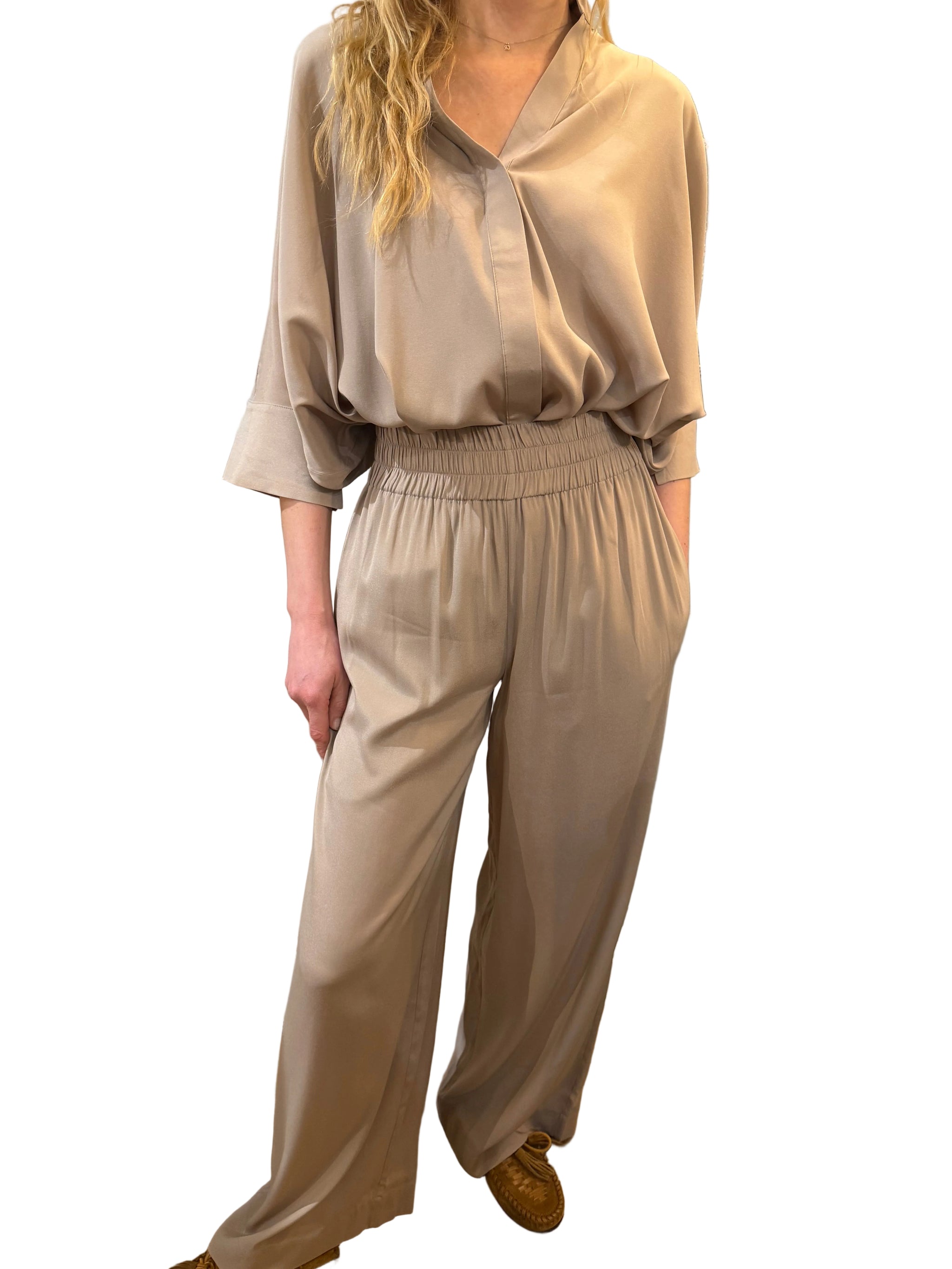 Wide leg pants in silk are a timeless summer style and this pair in a beige/caramel colour with a wide elastic waistband are a beautiful example. Wear with a simple top or a knit for a relaxed and stylish outfit.