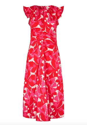 Large frills at the shoulders give this beautiful cotton poplin dress a striking silhouette as they give way to a fitted bodice with gathers at the neck and a skirt that falls to mid calf. Gathering also creates shaping down the front and a keyhole opening with single button is an elegant detail. The bold print of red and pink leaves adds a bit more drama into the mix.