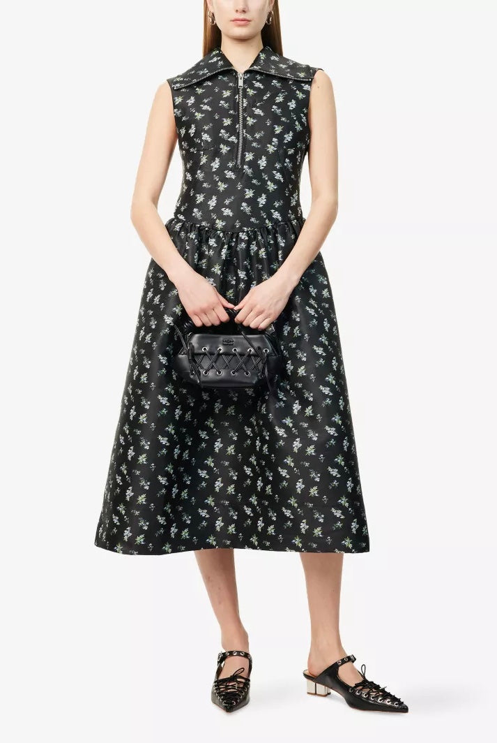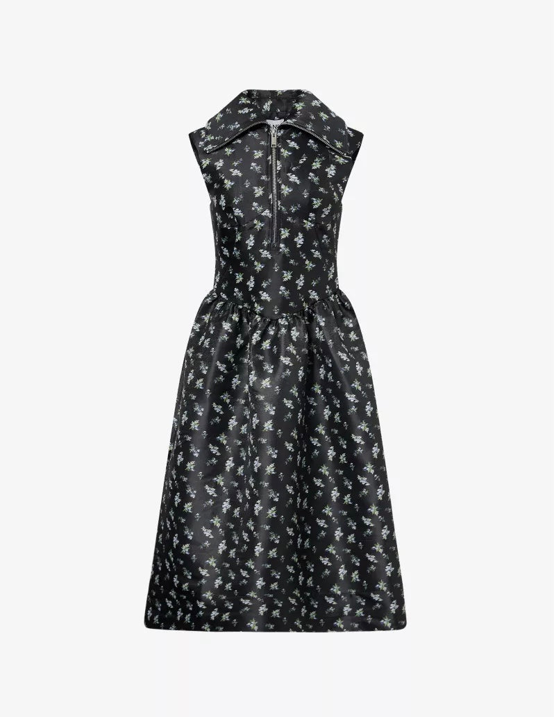 This Black Floral Jacquard Midi Dress features a collar, zip closure, a front pocket, side pockets and a flared skirt.