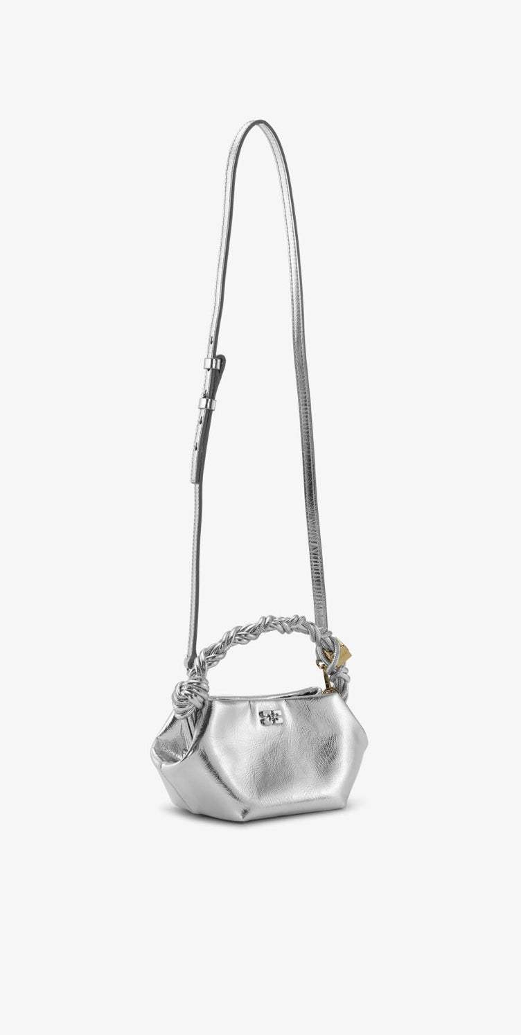 This Silver Mini Ganni Bou Bag features a tone-on-tone metallic GANNI Butterfly logo, a twisted handle with a braided knot, and a gold-tone metallic dice with a GANNI Butterfly logo engraved. The bag has an internal magnetic closure, a flat card pocket inside, and an adjustable and removable shoulder strap for crossbody wear.
