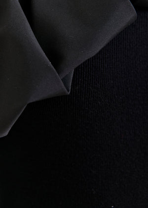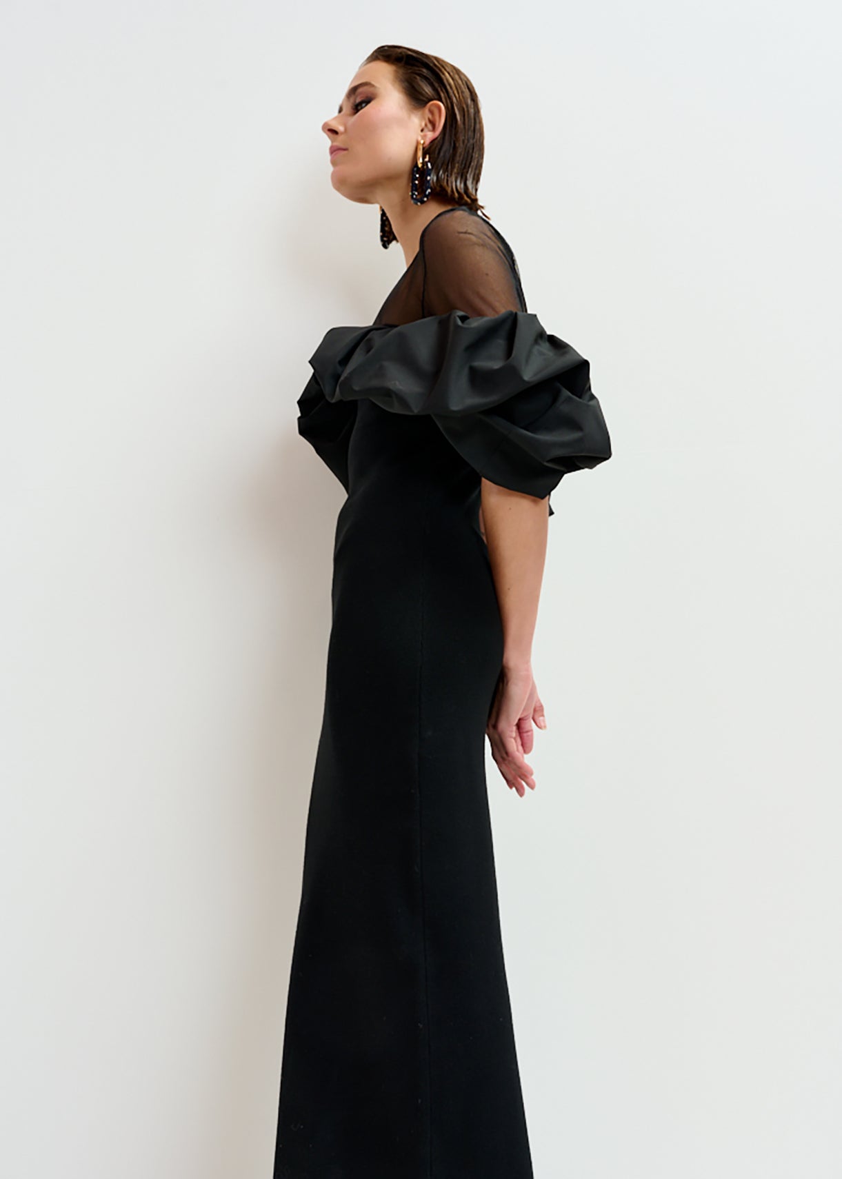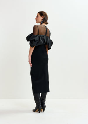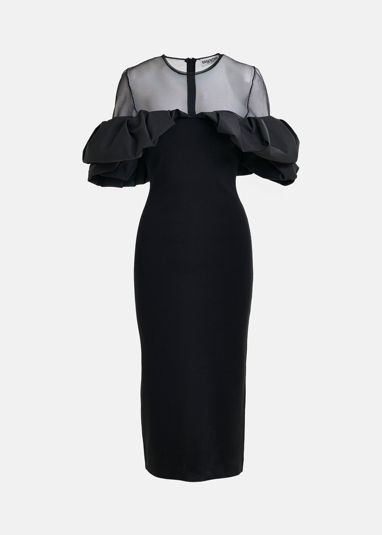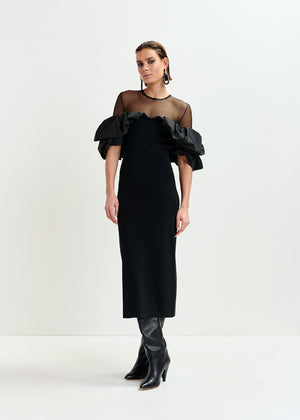 Ribbed dress features a close-fitting silhouette accented by voluminous ruffles that frame the shoulders for a dramatic effect. The sheer tulle yoke and sleeves add an airy lightness, balancing the structured design. Falling to a straight midi hem, it makes a striking choice for evening occasions.