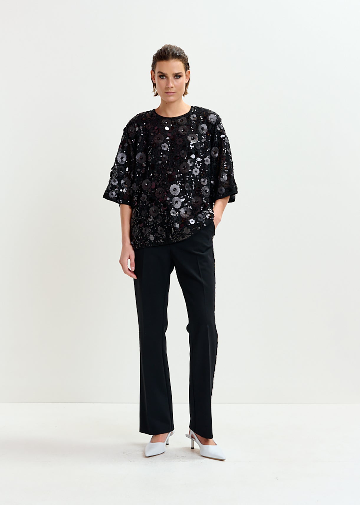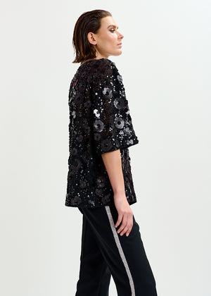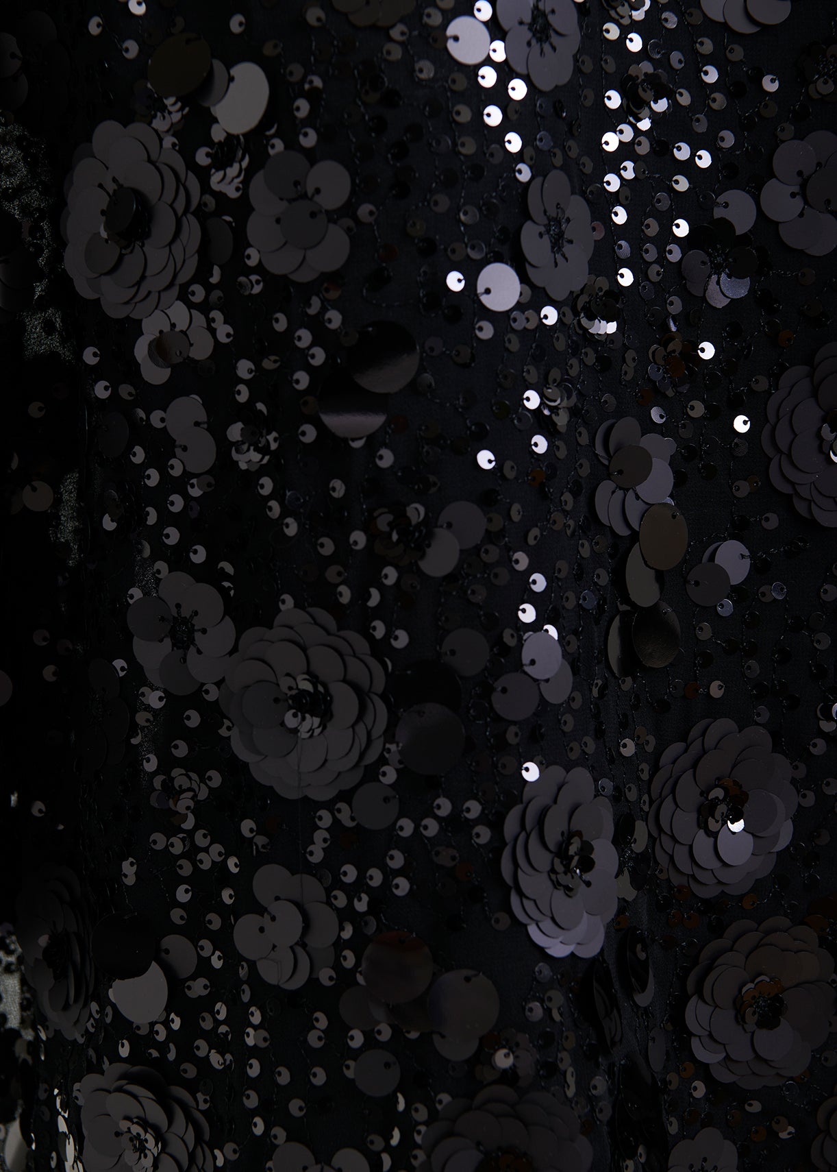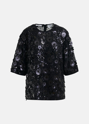 Crafted from partially recycled polyester, this top is densely embroidered with tonal flower sequins. The top holds its boxy silhouette, while dropped shoulders and an oversized cut enhance its relaxed structure. Finished with a clean round neckline and a discreet zip fastening at the back.