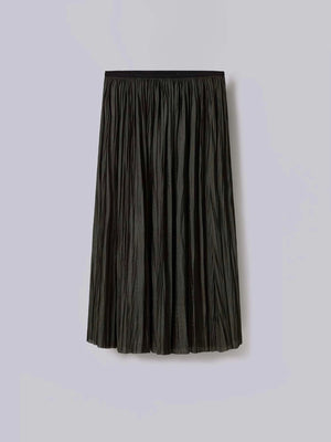 Pleated midi skirt in forest green made from polyester with a reversible glossy/matte finish. It features a comfortable elastic waistband and a laser-cut hem for a seamless finish.