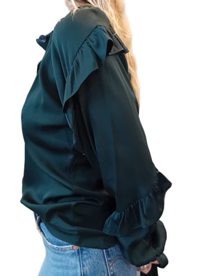 Crafted in 95% silk, 5% stretch, this blouse features ruffles, a tie-around neck and a graceful silhouette in a breathable material.