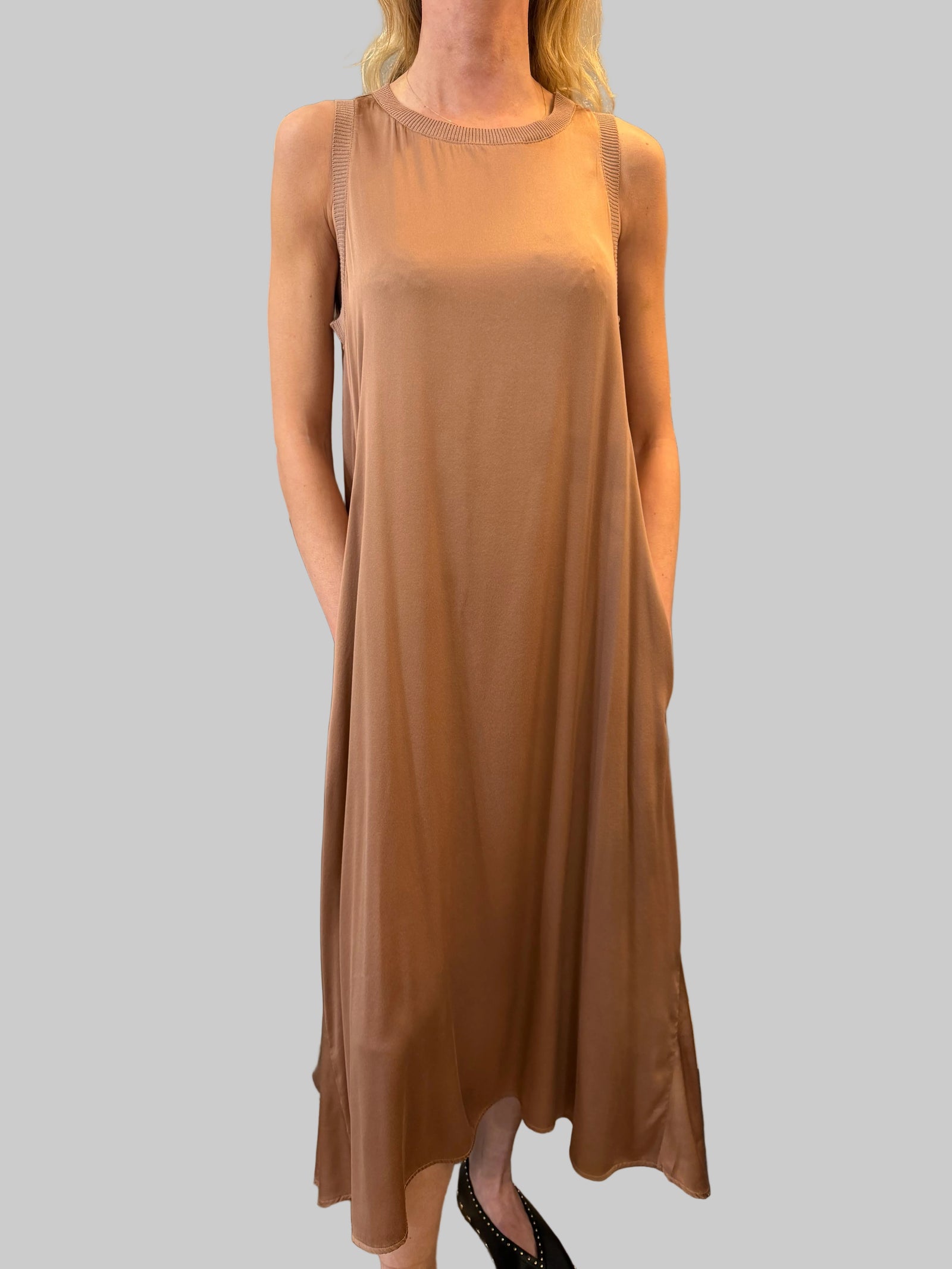 Transit Long flared dress with elbow-length sleeves in silk blend