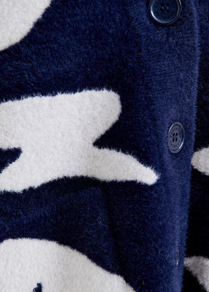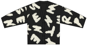 Cozy cardigan features an oversized silhouette with dropped shoulders for a relaxed fit, while rhinestone buttons add a playful accent to the all-over letter print.