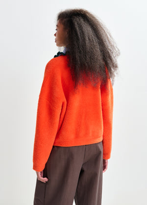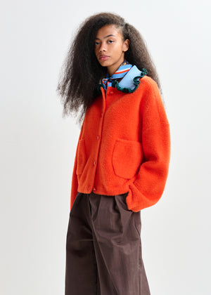 Cardigan in a tactile finish, designed with a button-front closure and two patch pockets. The look is defined by a contrasting color knit collar, accented with a colorful ruffle border for added definition and texture.