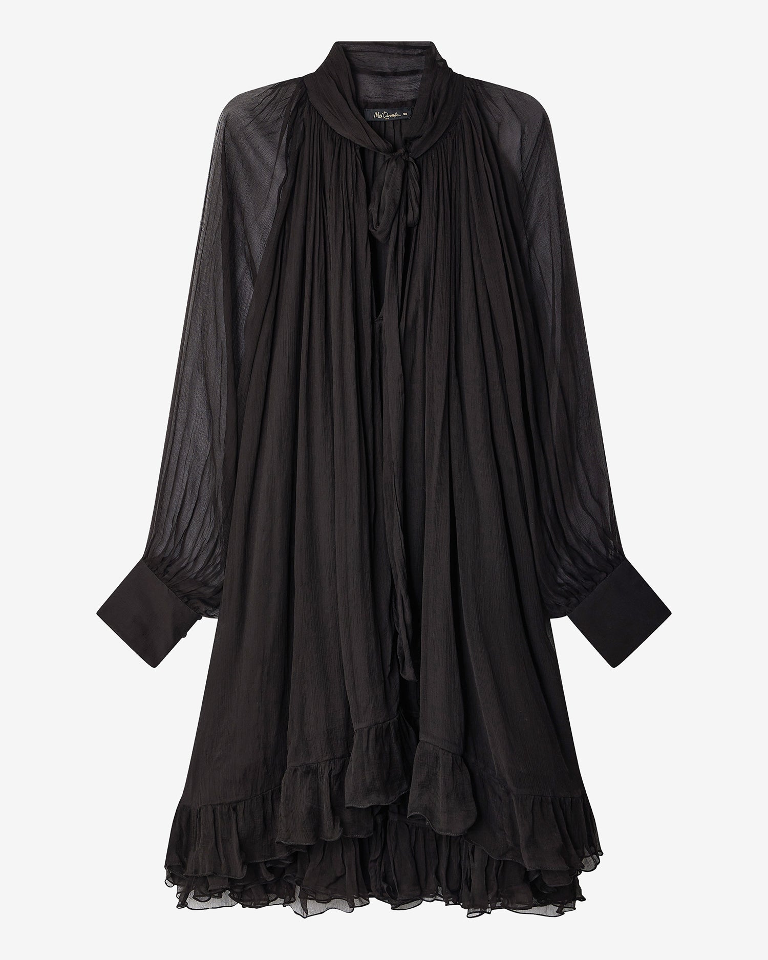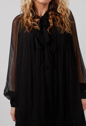 Black dress with bow tie neck, long sleeve with cuffs, crafted from a viscose chiffon fabric blend. 100% viscose; lining 100% cotton