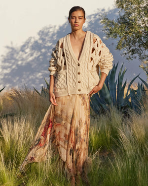 Loose ivory knit cardigan, crafted with large open cable patterns for a textured yet lightweight effect. Its deep V-neck highlights the neckline. Other features include patch pockets and wooden buttons on the front.