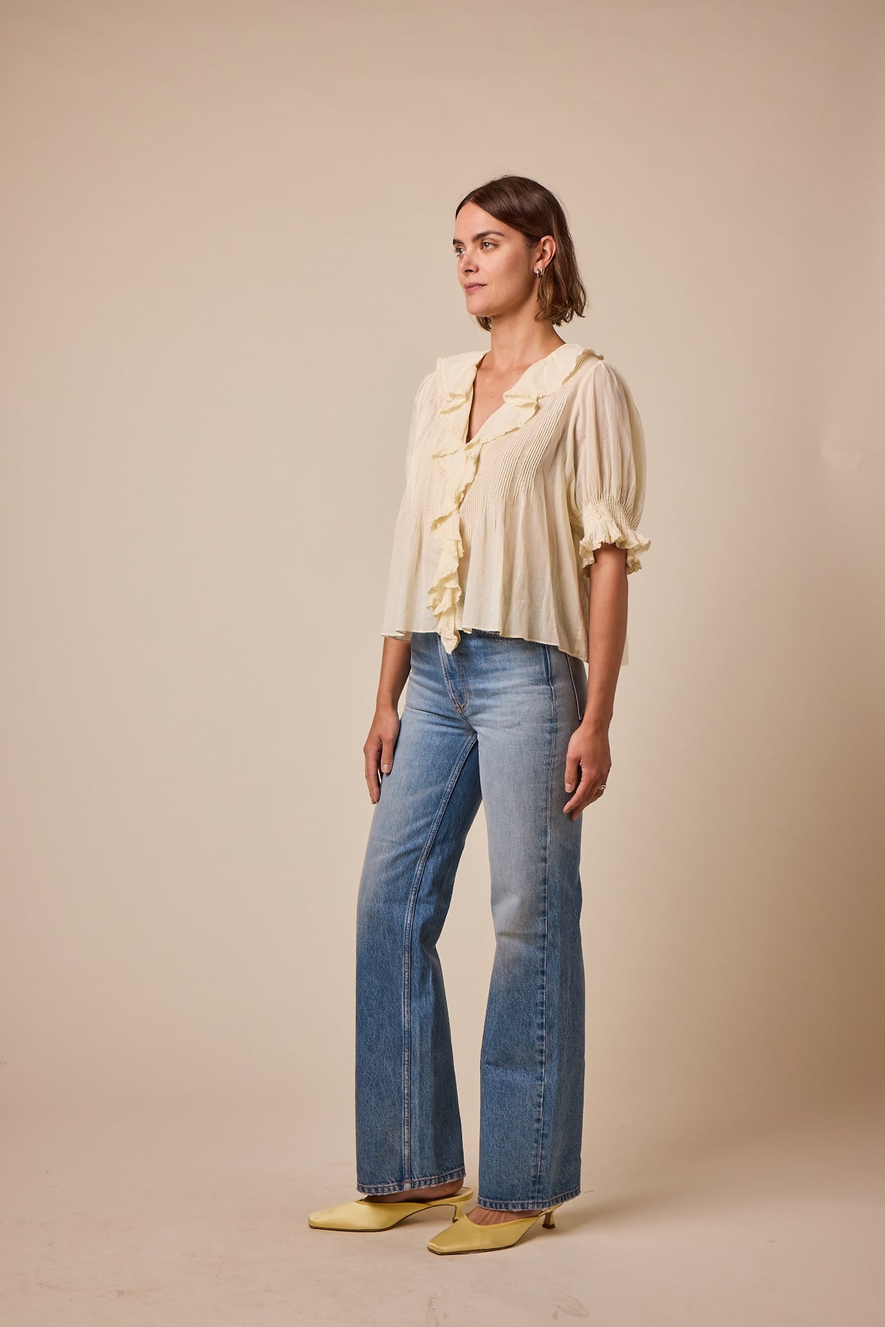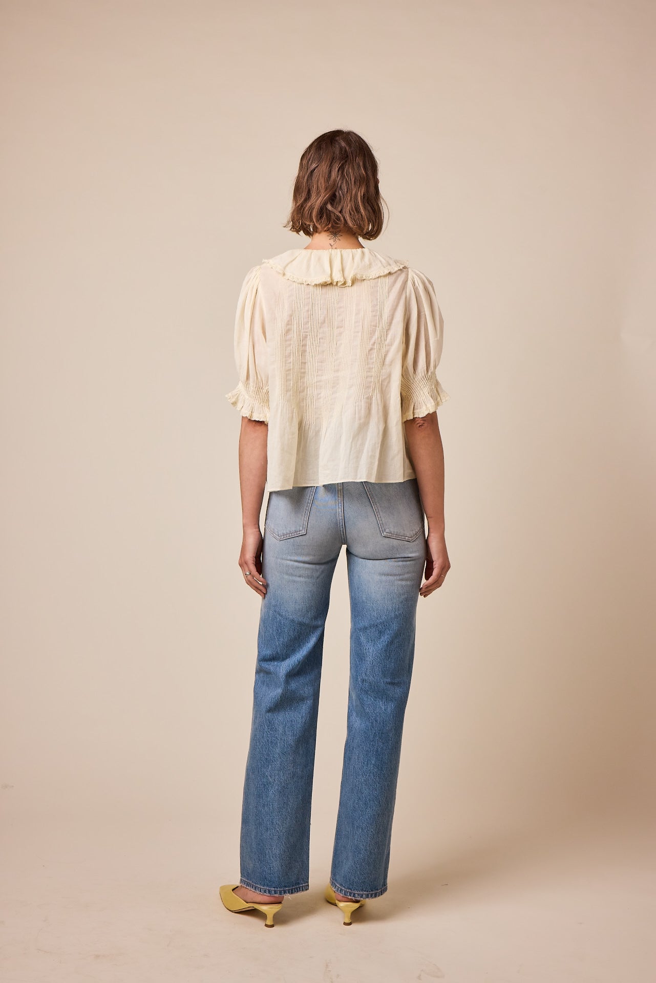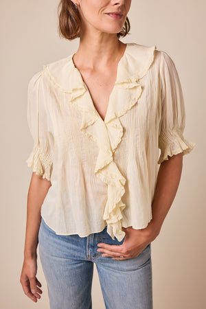 Crafted from the softest organic cotton voile, the Edwardian-inspired Henri Top—which made its debut in Spring 2018—is a Favorite Character we find ourselves returning to again and again. It features a plunging V-neckline framed with cascading lace-trimmed ruffles that extend down the bodice and delicate clustered pintucks at the yoke, back, and short puffed sleeves. A line of hidden starburst buttons run up the center front.