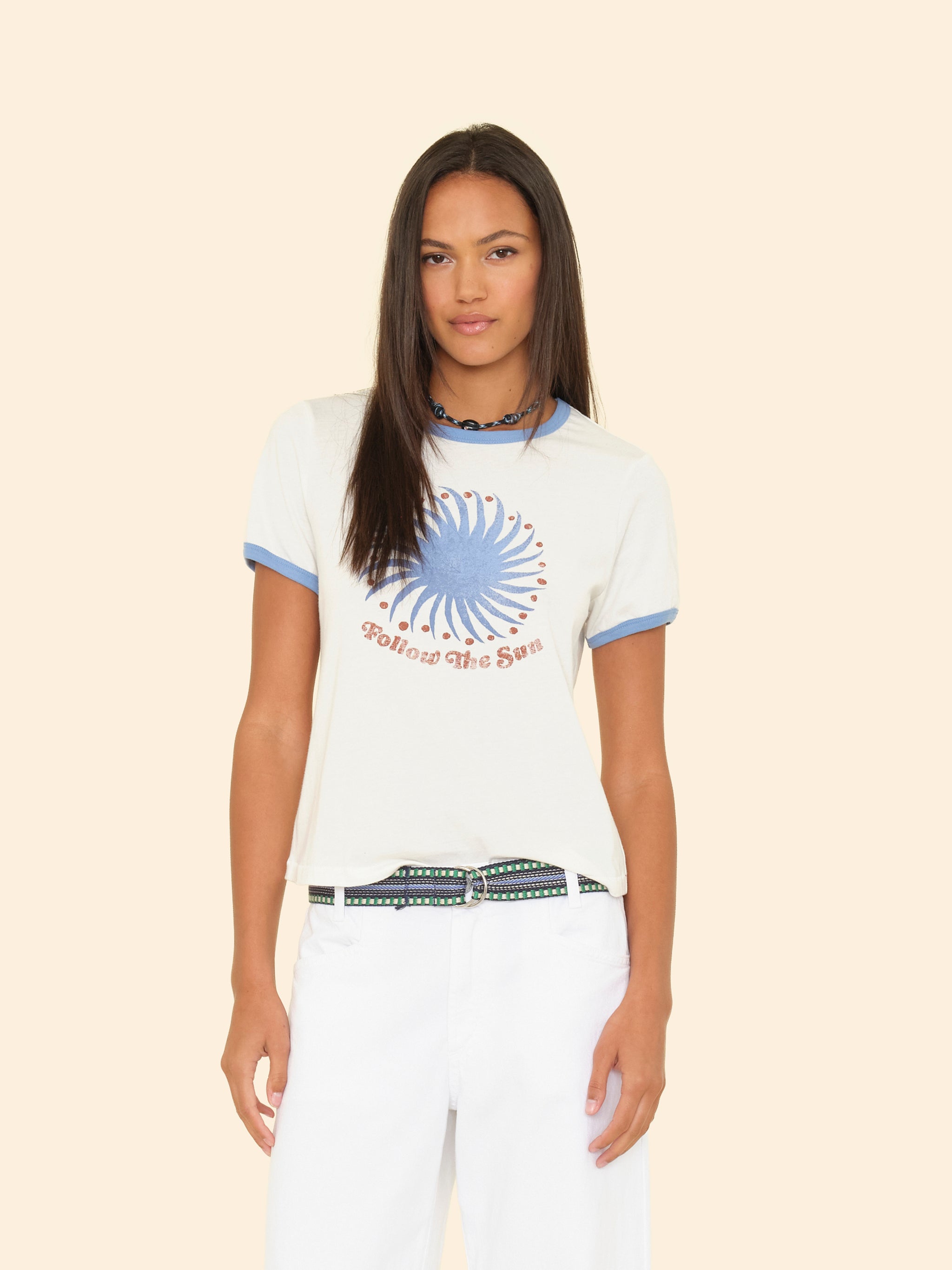 Sun Days. Frankie is made in our ultra-soft cotton jersey. This bestselling ringer tee features contrast color binding and a “Follow the Sun” graphic.
