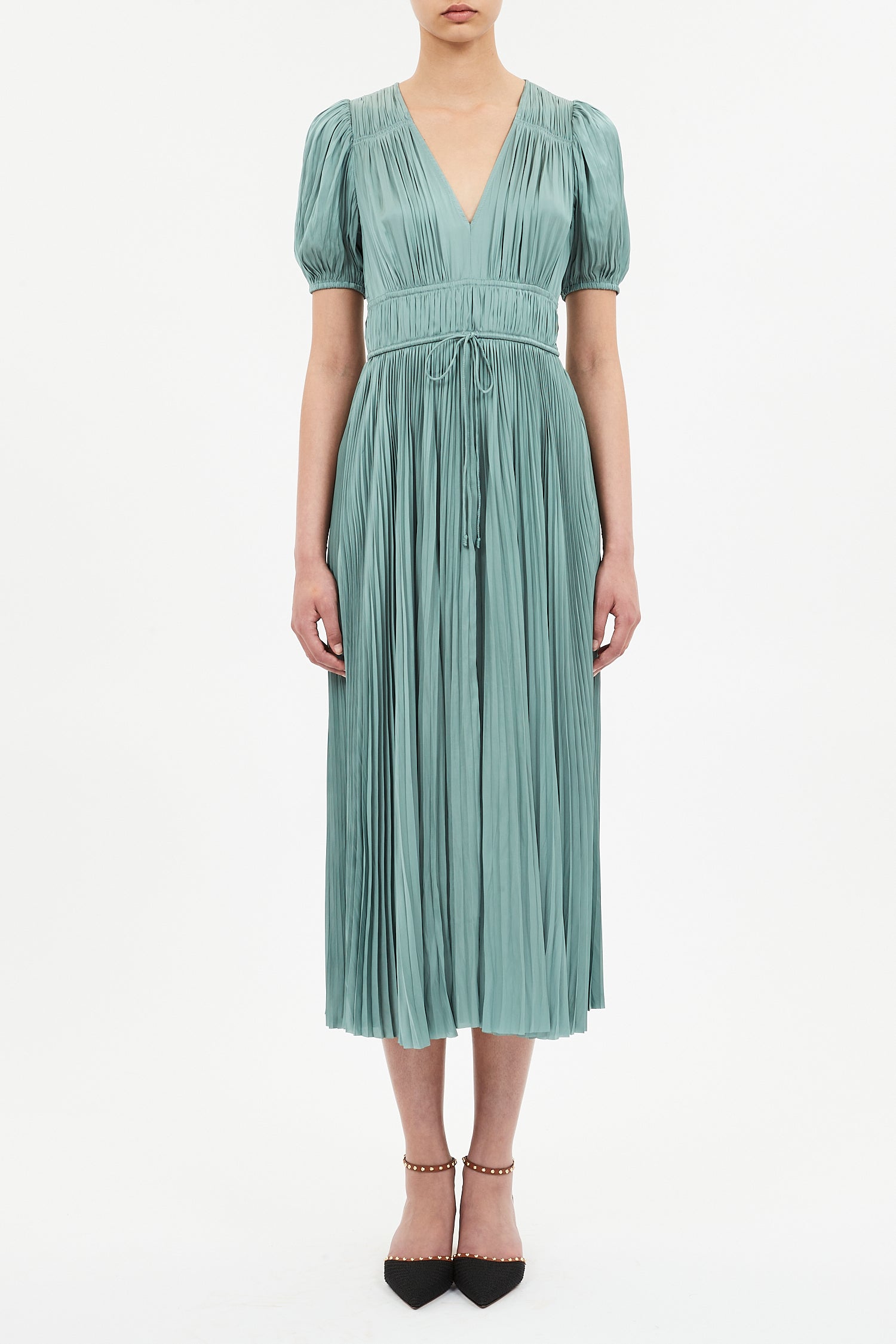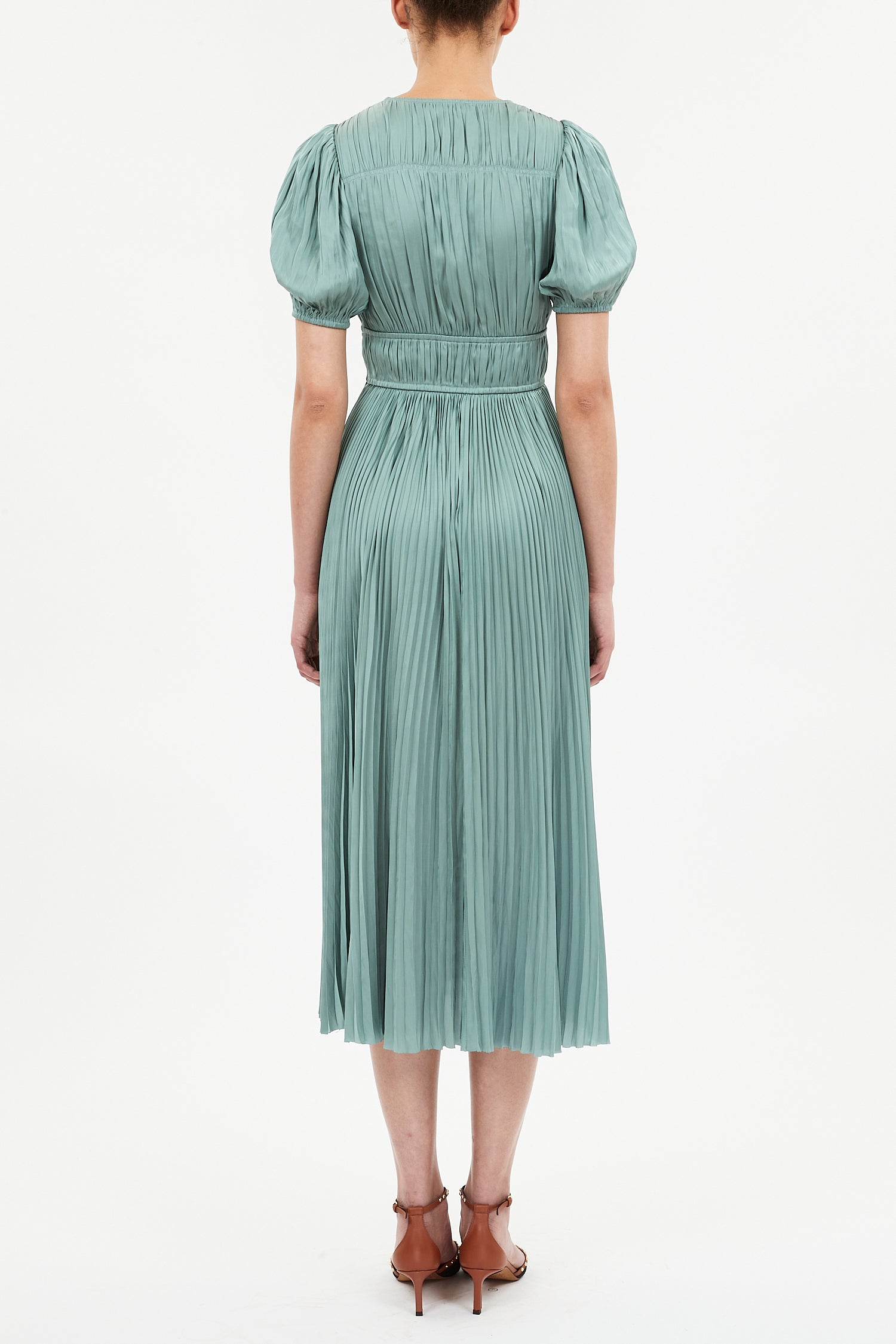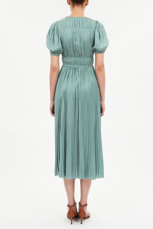 Audra puff sleeve satin midi dress in Sea Glass is made from light green plissé satin with a silken texture and subtle sheen.