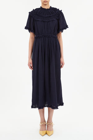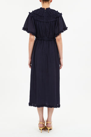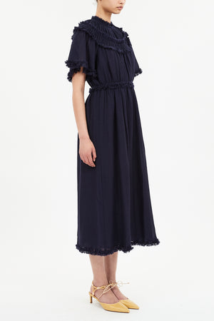 Ayan Short Sleeve Ruffled Midi Dress in Midnight (dark navy base).