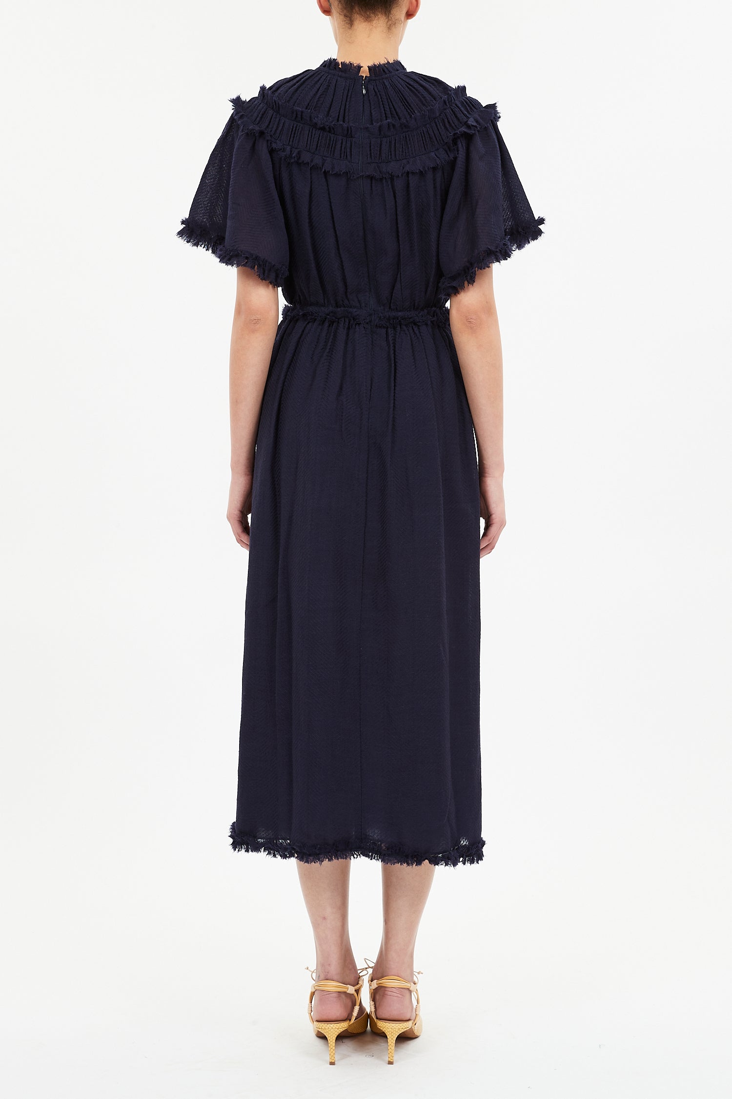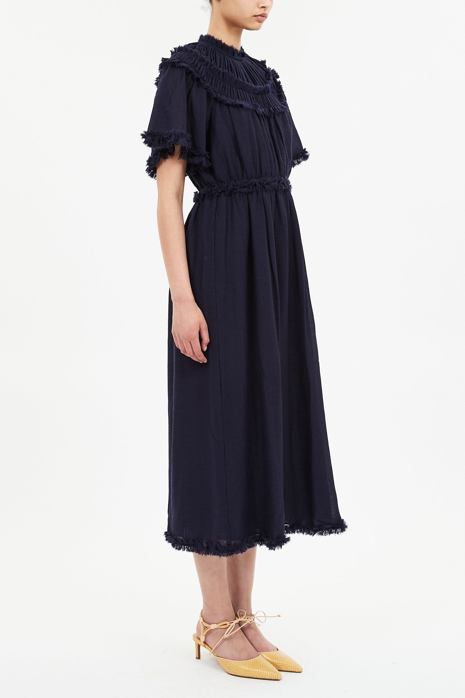 Crafted from fine wool, the fabric has a featherlight, lightly sheer presence, distinguished by delicate, regular ribbing that imparts understated texture. The upper bodice is graced with cascading, double-layered ruffles at the shoulders and neckline, each finished with a raw, delicately frayed edge for modern intrigue. The sleeves and hem are similarly adorned, elegantly uniting every detail. The waist is elasticated and the skirt A-line.