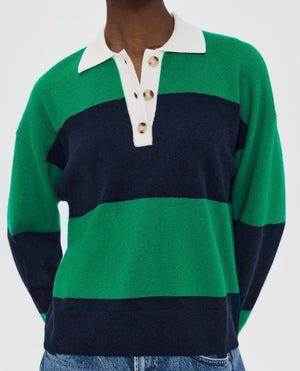 Striped Delight. Braxton is new this season inultra-soft striped cashmere wool blend. This rugby-inspired polo sweater features faux horn buttons and ribbed cuffs and hem.