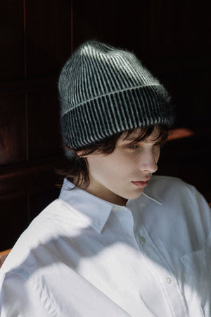This beanie is made of a very light and warm material obtained by brushing raccoon fur