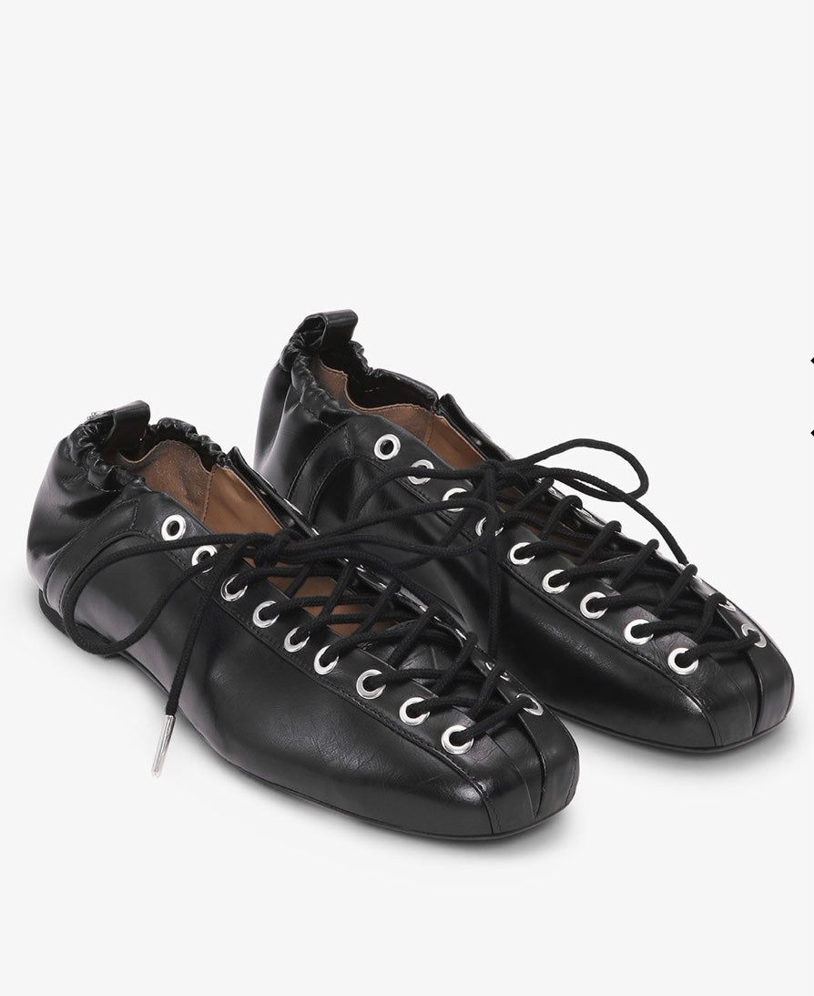 Inspired by 1920s lace-up boots, these Black Oleatex Lace-Up Ballerinas build upon the legacy of our beloved Buckle Ballerina. Presented in a Fabrics of the Future crinkle Oleatex blend, these ballerinas feature signature metal eyelets and crossover wax laces that tie at the front for easy slip-on wear.