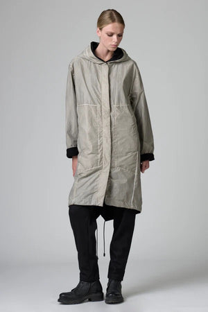 Hooded cotton and nylon trench coat featuring distinctive cuts and an original vent on the back. It is fully lined with pure boiled wool. It is a cold-dyed, knee-length garment that is fastened with a zip.