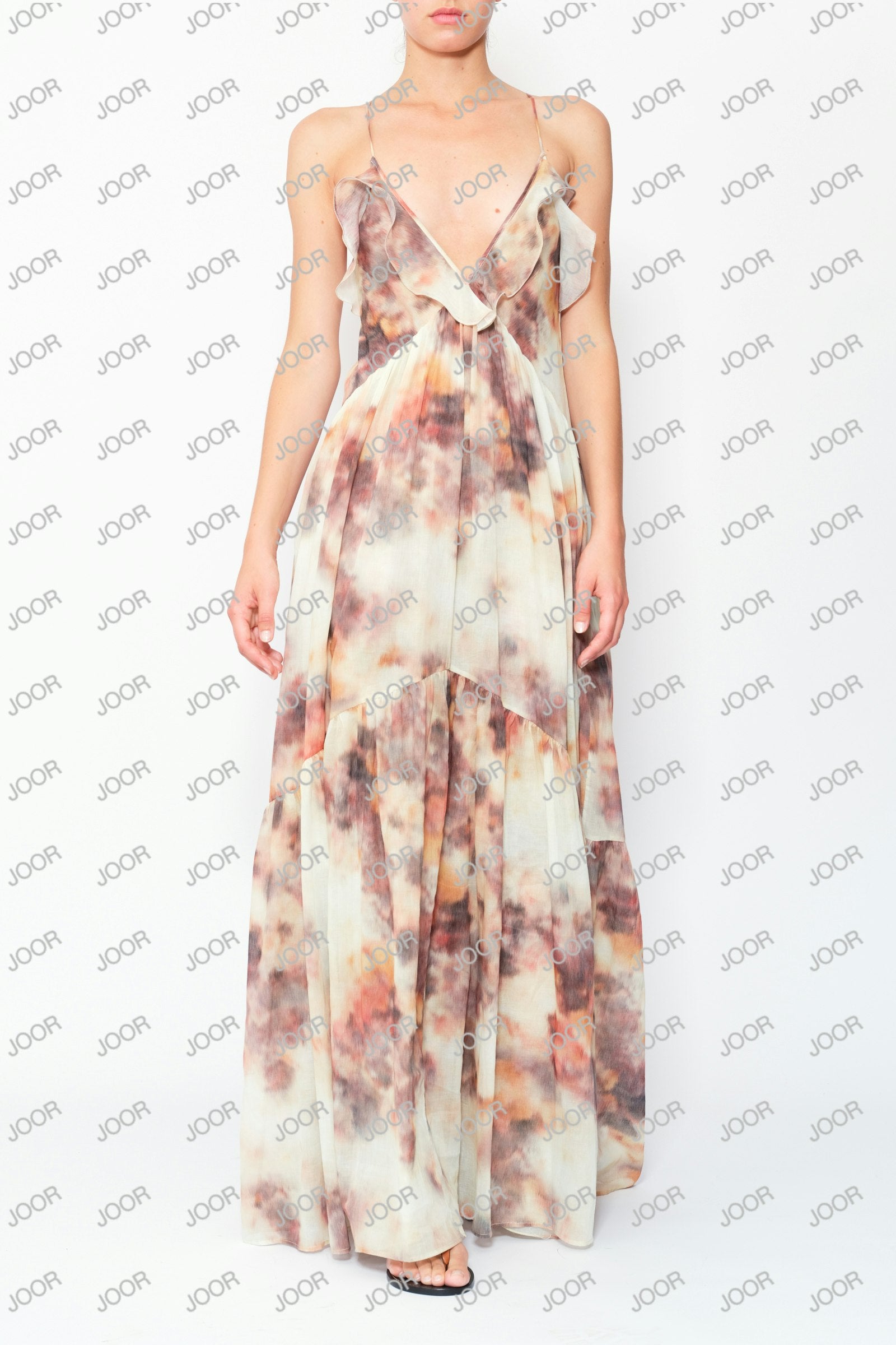 Marant Étoile's 'Vasma' dress has a ruffled V-neckline and delicate ladder trims. Cut from a beige cotton-blend print, it has a relaxed, tiered shape and pin-thin straps.