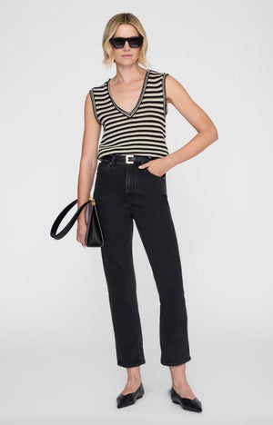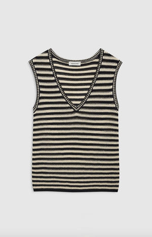 Featuring a flattering V neckline and clean sleeveless silhouette framed by contrast trim, the Lowen Sweater is defined by its timeless stripes and refined knit texture. The classic black-and-cream stripe lends a subtle Parisian sensibility, while the streamlined shape makes it an effortless pairing for tailored trousers or relaxed denim. Polished yet easy, making it an elevated everyday essential.