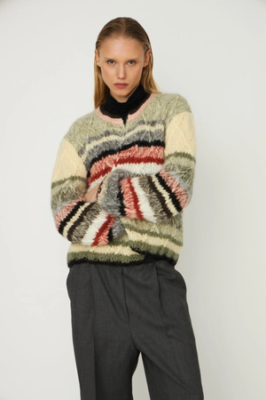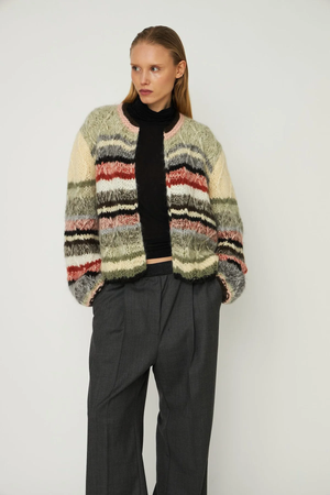 GABI is a hand knitted cardigan with a round neckline, cropped fit and clean silhouette. The knit is designed in colorful horizontal stripes that highlight its playful character. This piece is hand knitted by Italian women working from their homes in Tuscany. It is a slightly shorter version of the MARS cardigan and designed without pockets. An exclusive Italian hand knit that reflects the heart of the DAWNxDARE identity - rooted in craftsmanship, color and individuality.