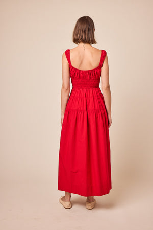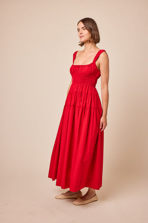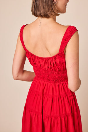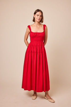 Crafted from crisp organic cotton poplin, the Clover Dress is an easy-wearing, romantic silhouette. Featuring a softly scooped neckline, the bodice is elasticated for comfort and shape, accented with clean, fixed straps. Gentle shirring through the bodice and waist gives way to a midi-length skirt with subtle hip tiers.