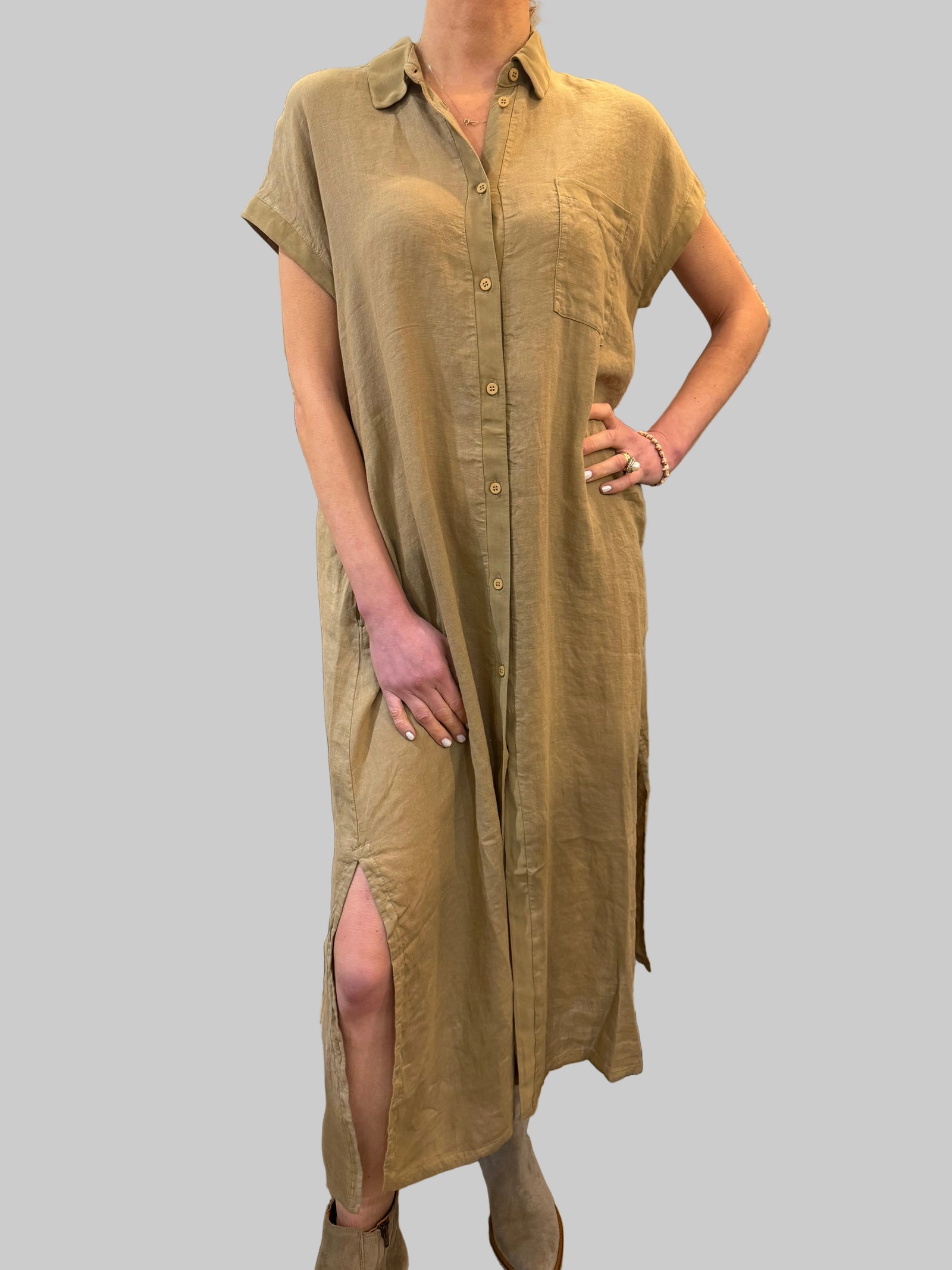 £275.00 GBPTransit Long straight-line linen dress with front buttoning and viscose georgette inserts