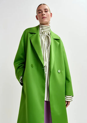 Crafted from recycled polyester, this coat is designed for an effortlessly oversized fit. The double-breasted front is complemented by softly draped lapels, enhancing its relaxed silhouette. Dropped shoulders and slanted pockets add to the laid-back refinement, while the full lining ensures smooth layering.