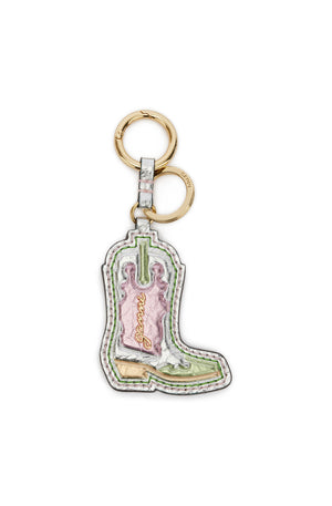 This keyring is designed in the shape of a cowboy boot, featuring a pink, green and gold color with stitching details. The keyring comes with a ring and clasp.