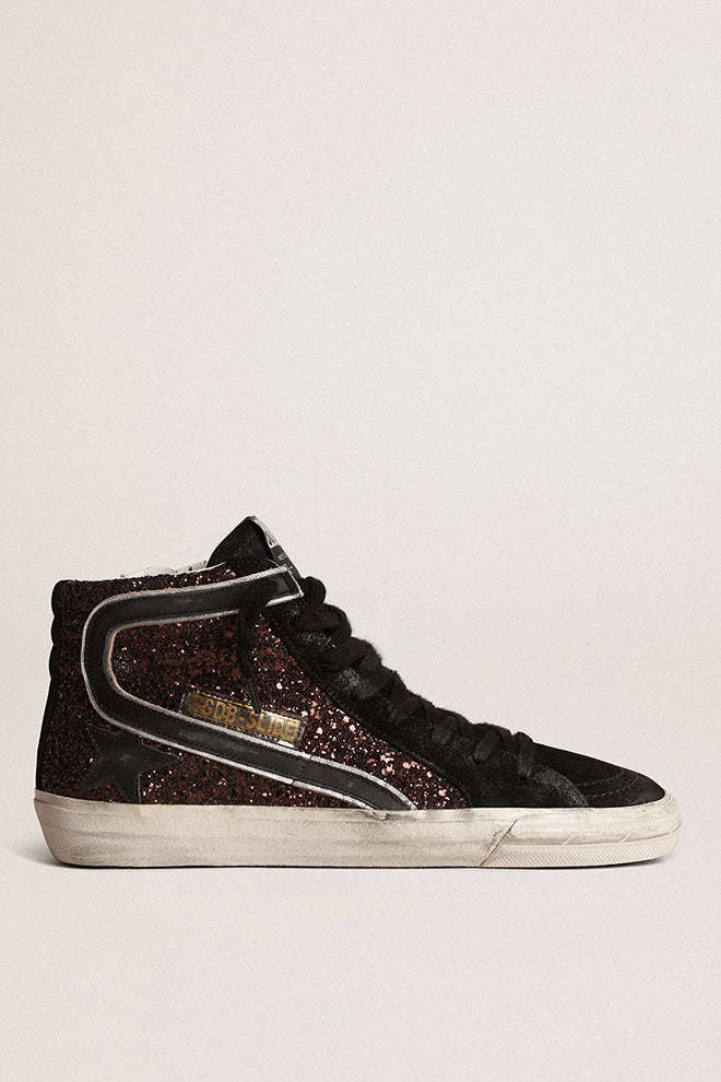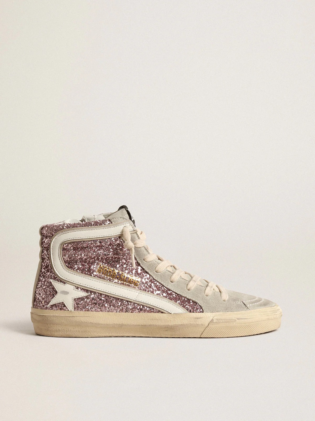 £535.00 GBPGolden Goose Slide in lilac glitter with white leather star and flash