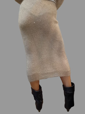 Taupe skirt embellished with sequins. 60% Mohair 30% Polyamide 8% Cotton 2% Wool
