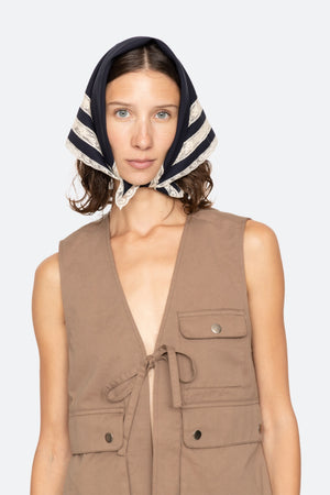 The Ethel handkerchief is crafted from lightweight tropical wool with delicate lace inserts and an embroidered Sea logo. Versatile in design, it can also be styled as a headpiece for a quietly cool finish.