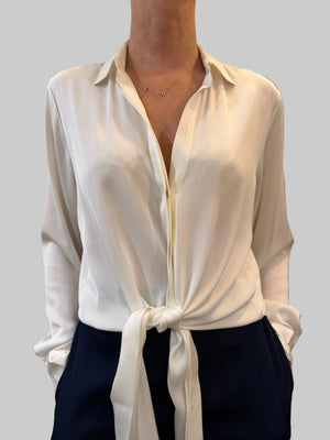 Made from authentic Thai silk, this blouse features a white colour. The adjustable tie hem adds a subtle modern detail, giving you flexibility to style it your way.
