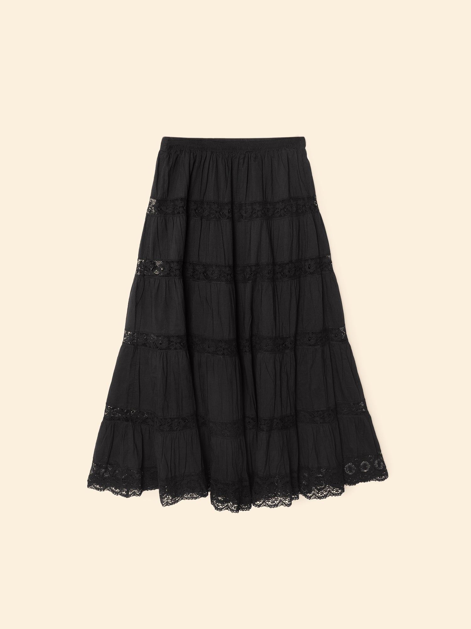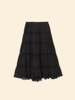 Delicate Details. Amore is new this season in our superfine cotton voile with a soft hand. This ultra-femme midi skirt features a flat front and elasticized back waist with lace trim throughout.