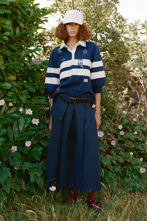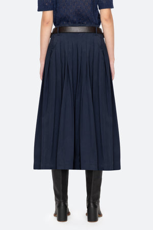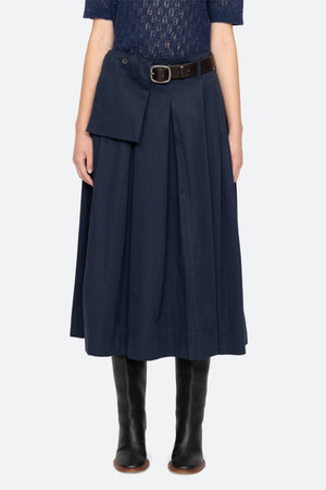 The Andrea workwear skirt features a pleated midi-length silhouette, paired with a leather belt and removable belt bag. Combining practical utility with modern refinement, it reinterprets classic workwear with effortless sophistication.