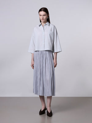 Midi pleated skirt crafted from polyester with a reversible glossy/matte finish. The piece features an elastic waistband and a laser-cut hem for a seamless finish.