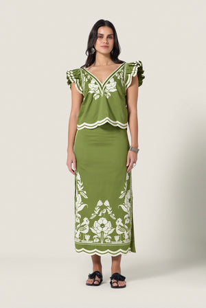 Elegant and quietly expressive, the Sandina Skirt celebrates artisanal craftsmanship through delicate hand-finished detail. French knot embroidery and subtle bead accents bring depth and refinement to this graceful silhouette.