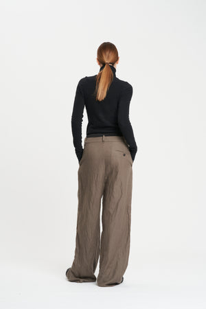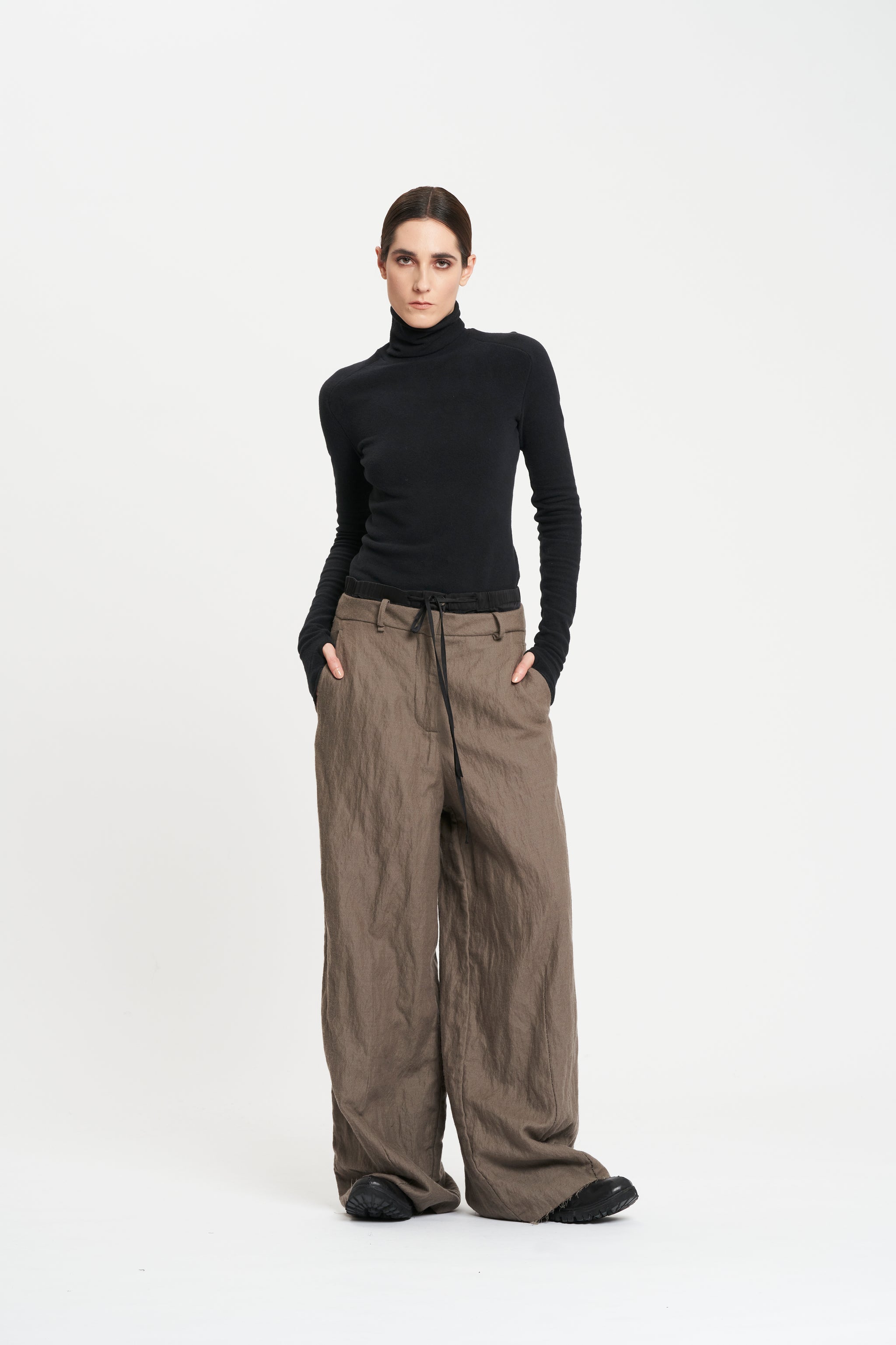 Dust pant with elastic waist and drawstring. Two side pockets, back pocket with button