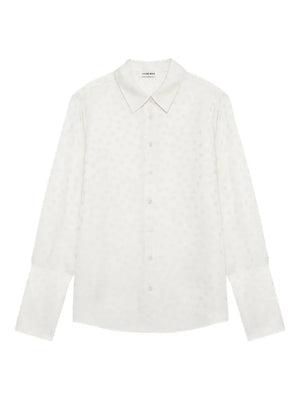The Amanda Shirt in Ivory dot jacquard features a front button fastening, long sleeves, buttoned cuffs and a collar.