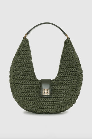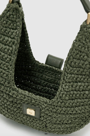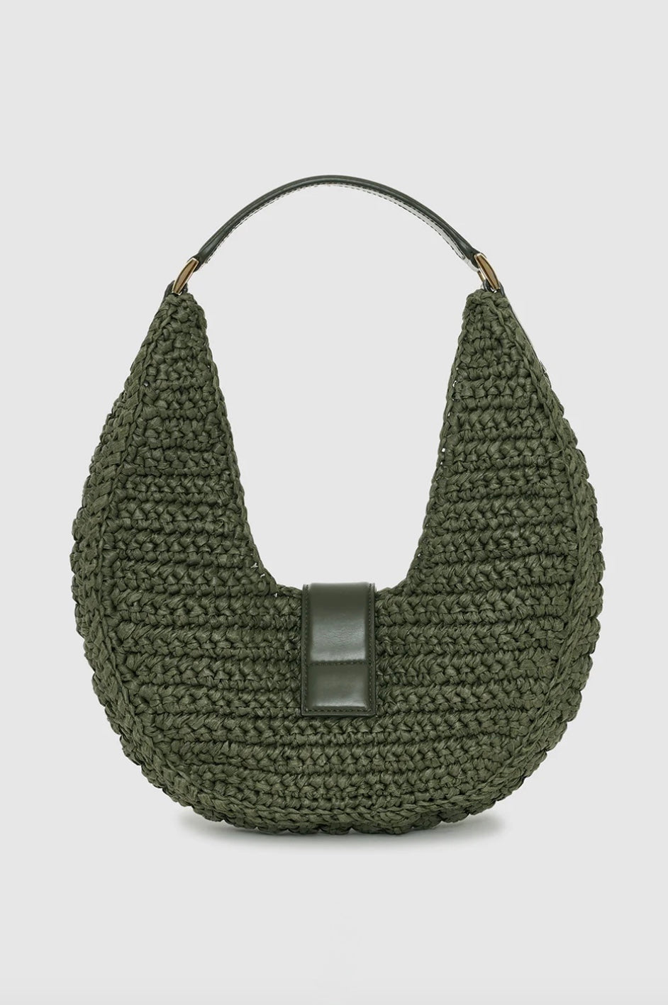 A seasonal shoulder bag made from a woven olive green seagrass material with tonal leather details.