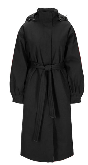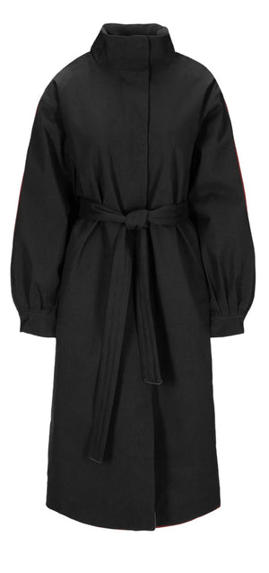 Rossby Maxi Coat in New Black, is a long feminine and waterproof rain jacket with 80g Thermolite Eco insulation made from recycled fabric. The rain coat has balloon sleeves and belted waist, which makes your silhouette shine. The coat has a detachable hood that can be hidden in collar.
