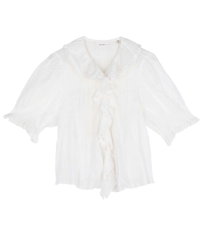 Crafted from the softest organic cotton voile, the Edwardian-inspired Henri Top - which made its debut in Spring 2018 - is a Favorite Character we find ourselves returning to again and again. It features a plunging V-neckline framed with cascading lace-trimmed ruffles that extend down the bodice and delicate clustered pintucks at the yoke, back, and short puffed sleeves. A line of hidden starburst buttons run up the center front. Wear it loose, or tuck it into your favorite high-waisted jeans.