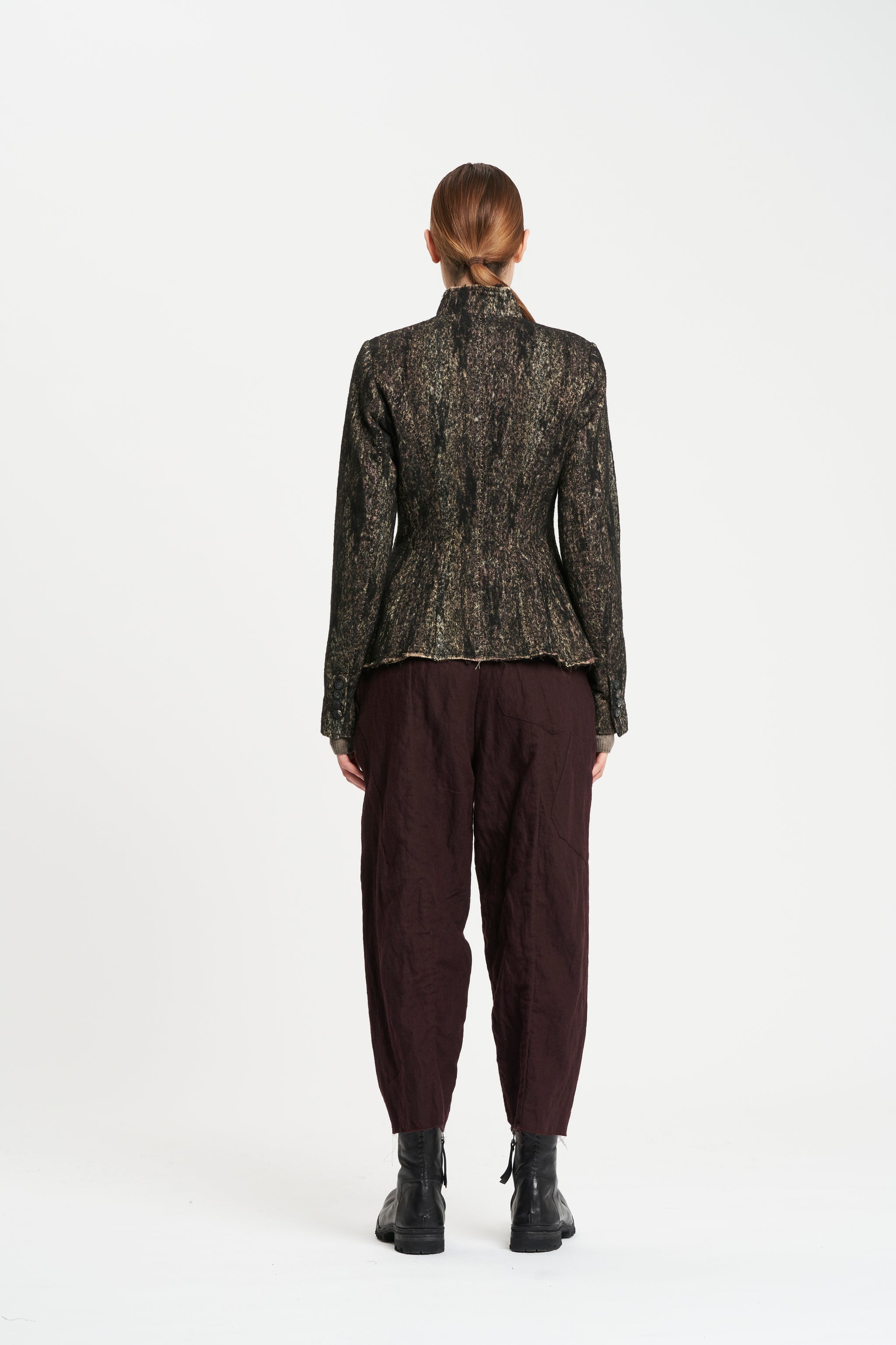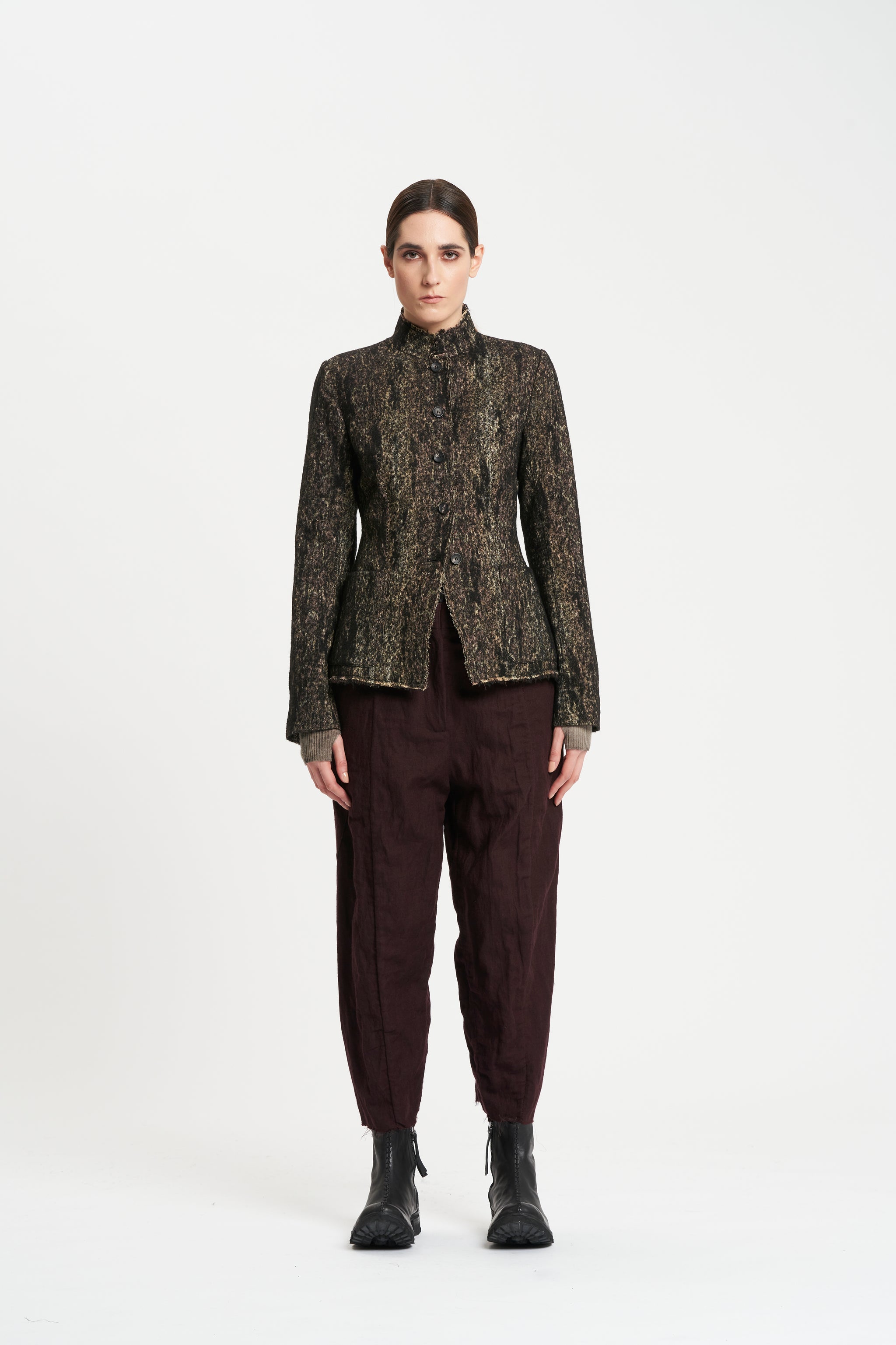 Masnada black painted single breasted jacket with a stand-up collar, pockets in the front and stitching details
