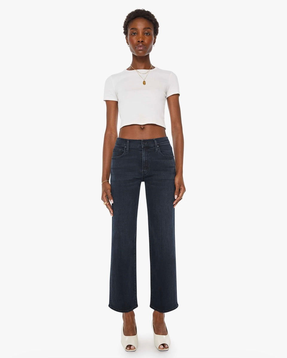 Mid-rise jeans with a wide straight leg, zip fly and clean ankle-length inseam. Made from denim with a touch of stretch, Night In Venice is a dark denim wash.